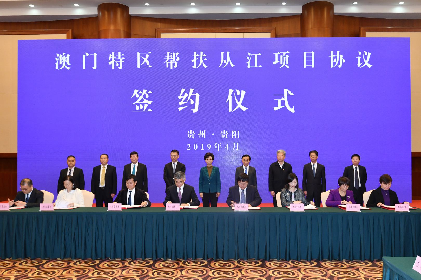 扶贫工作会议结束后,随即举行了2019年澳门特区帮扶从江项目协议签约仪式。澳门特区政府教青局、文化局、旅游局、旅游学院、澳门基金会、中联办社工部、中国银行澳门慈善基金会、澳区全国政协委员等机构和代表分别与从江县有关单位签署了共9项项目帮扶协议,范畴涵盖教师培训与奖励、学校建设、文化交流与合作、旅游发展和人员培训、人居环境改善以及捐助帮扶等。
