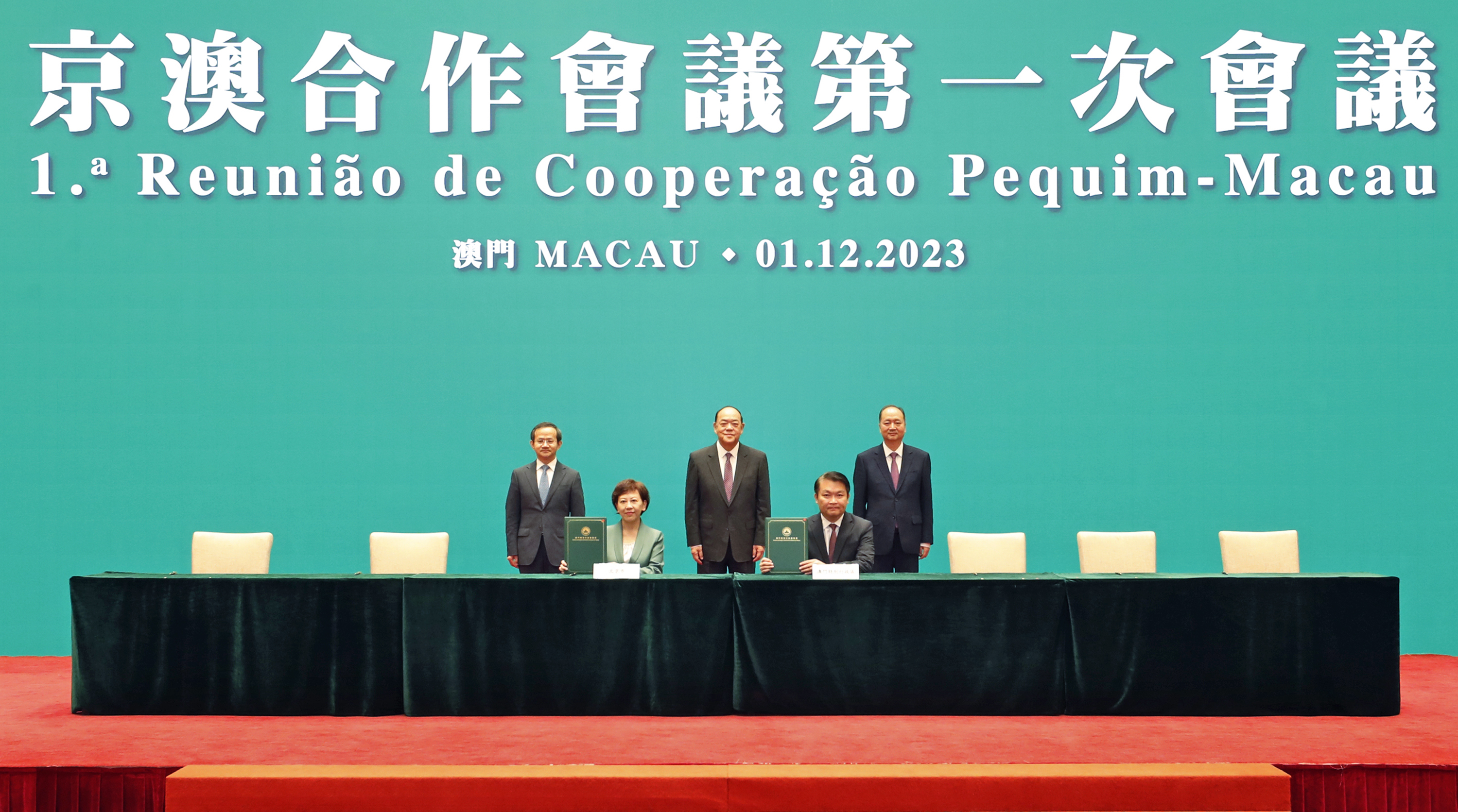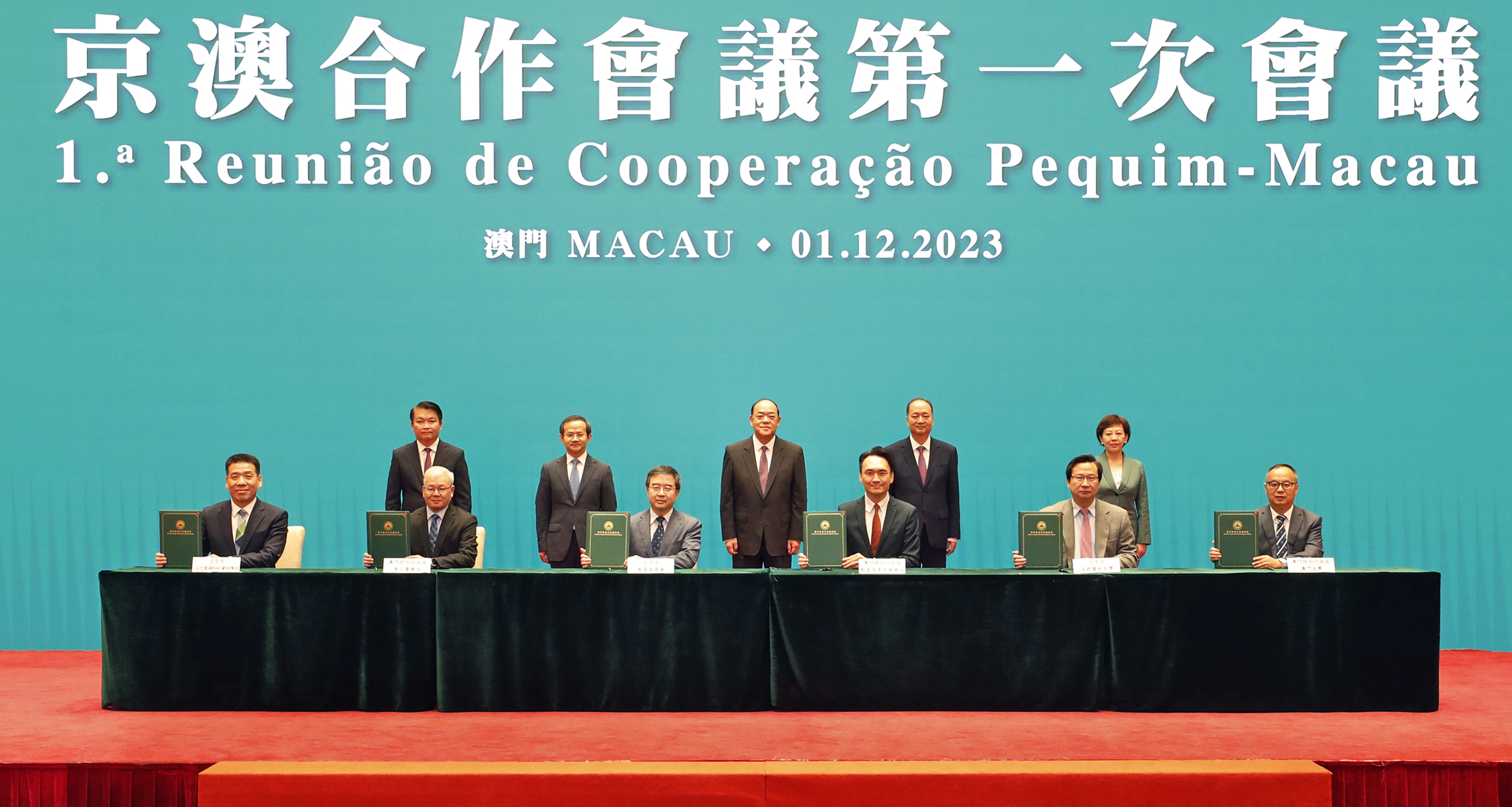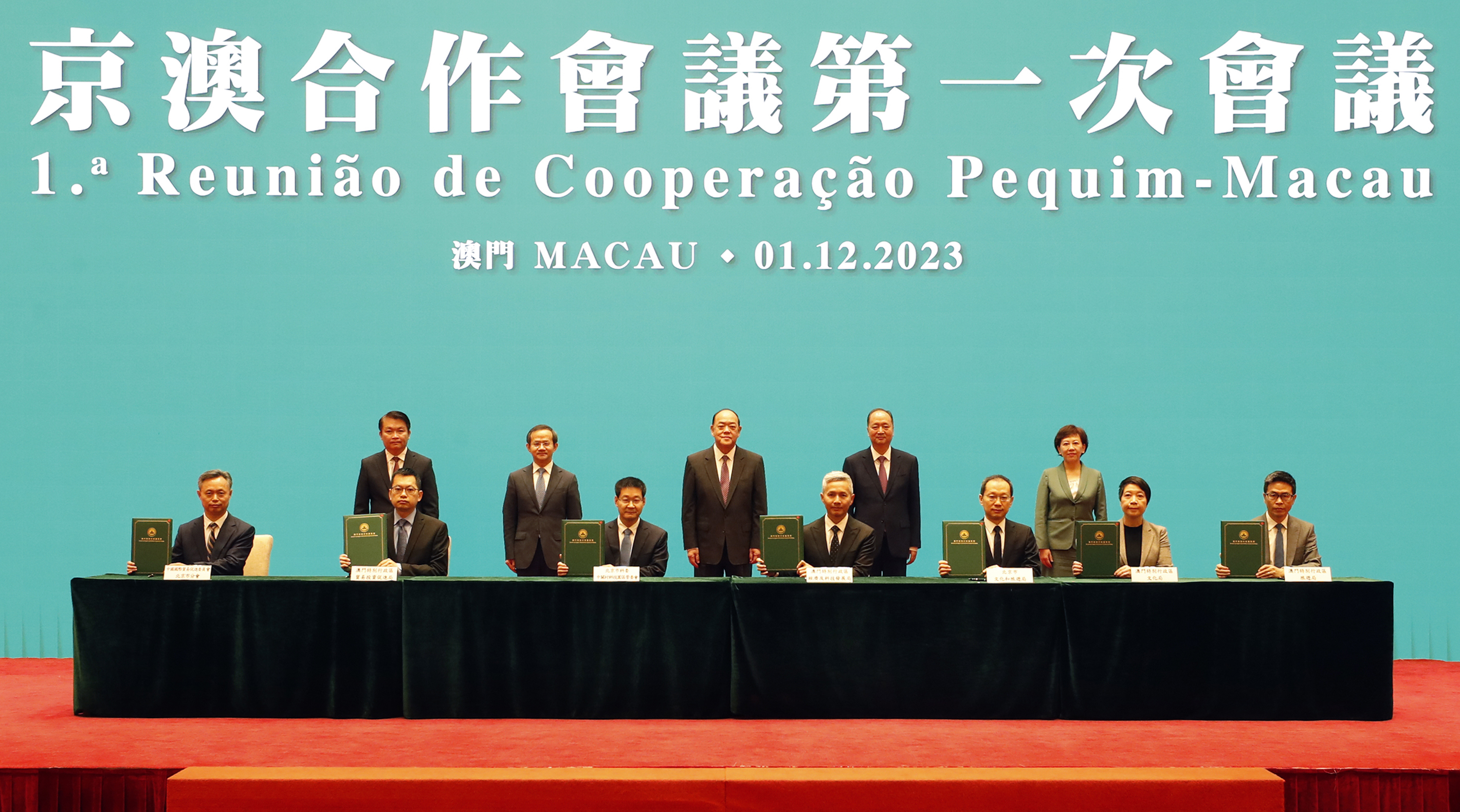 会议后,行政长官、殷勇市长等共同见证了《京澳合作会议第一次会议备忘录》、《深化京澳科技创新合作备忘录》、《中国国际贸易促进委员会北京市分会 澳门贸易投资促进局战略合作框架协议》、《北京市文化和旅游局与澳门特别行政区政府文化局、旅游局开展文旅交流合作备忘录》、《北京市教育委员会与澳门特别行政区政府教育及青年发展局合作协议》、《京澳职业培训交流合作协议》及《教育和科学合作备忘录》的签署仪式。