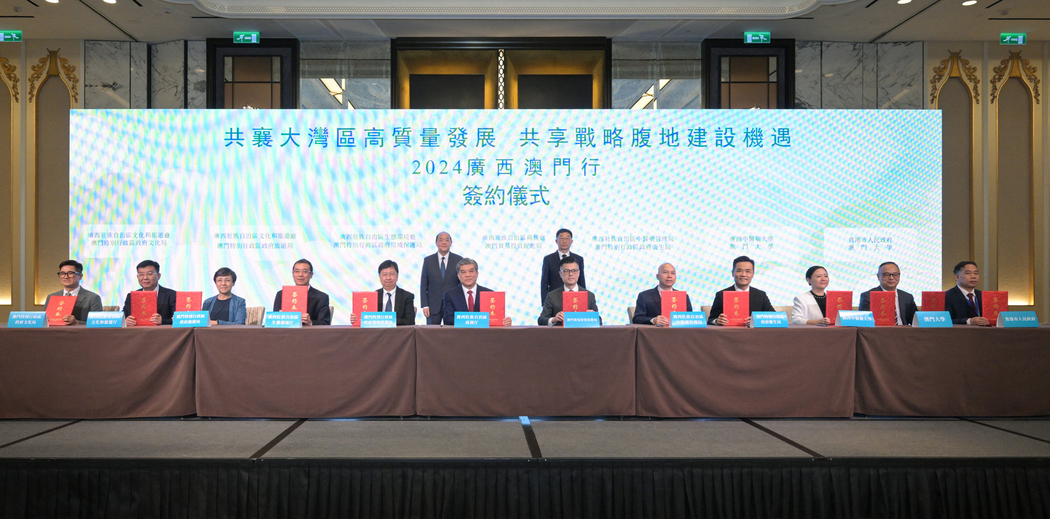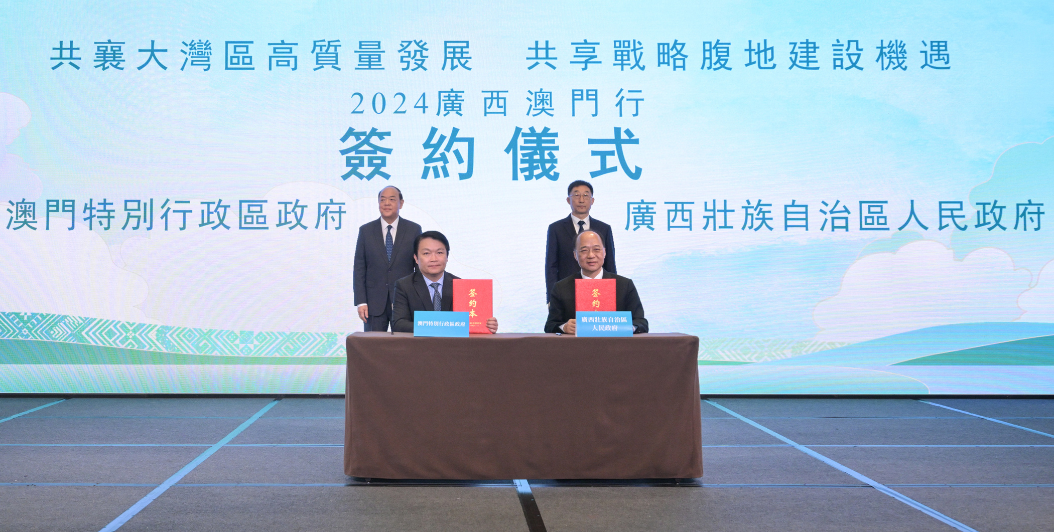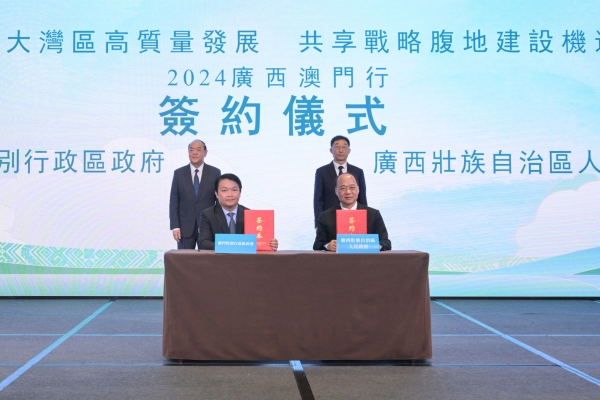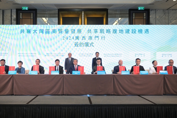 行政长官贺一诚今(24)日出席广西打造粤港澳大湾区重要战略腹地2024澳门推介会暨合作协议签约仪式。他致辞时表示,桂澳双方共同贯彻落实习近平主席提出“把广西打造成为粤港澳大湾区重要战略腹地”的重要指示精神,着眼新发展阶段和高质量发展,双方签署的合作协议,为桂澳合作的持续发展不断注入新的动力。