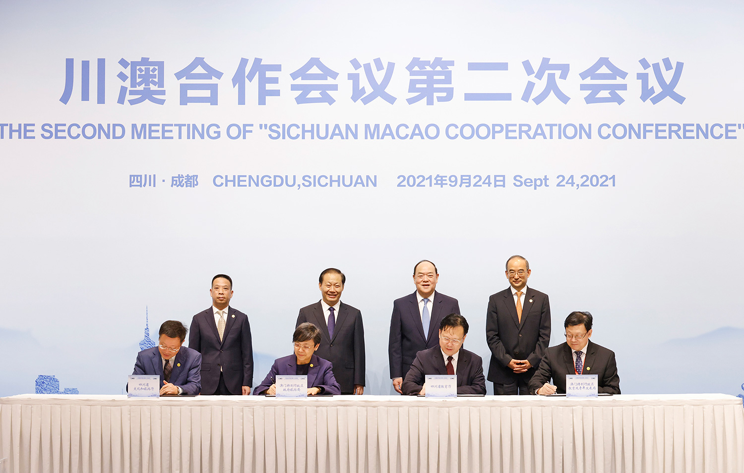 會議後,行政長官、彭清華書記及黃柳權副主任等見證了《四川與澳門加強旅遊合作備忘錄》及《“澳門青年學子四川感知行”活動合作備忘錄》的簽署儀式。