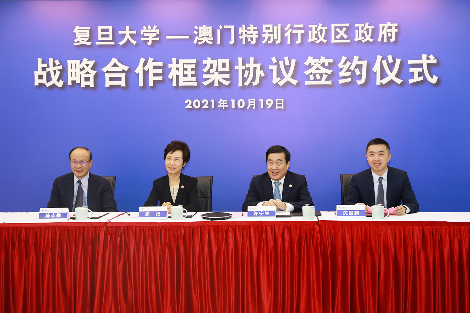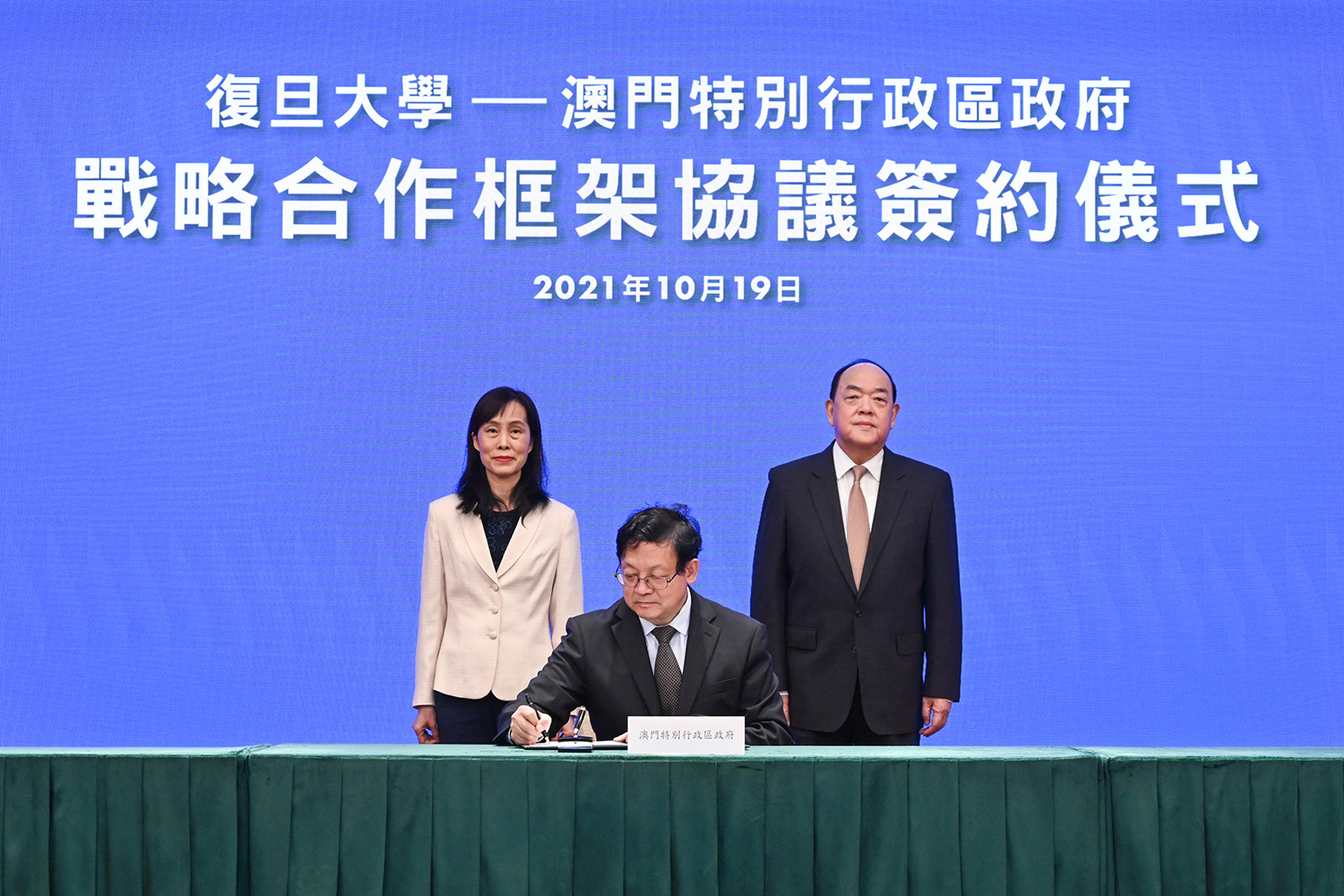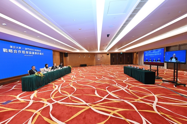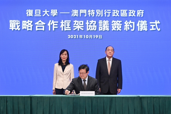 其後,雙方透過視頻連線方式,在行政長官賀一誠、社會文化司司長歐陽瑜;復旦大學由復旦大學黨委書記焦揚、校長許寧生的共同見證下,特區政府教育及青年發展局局長老柏生與復旦大學副校長陳志敏簽署了合作協議。