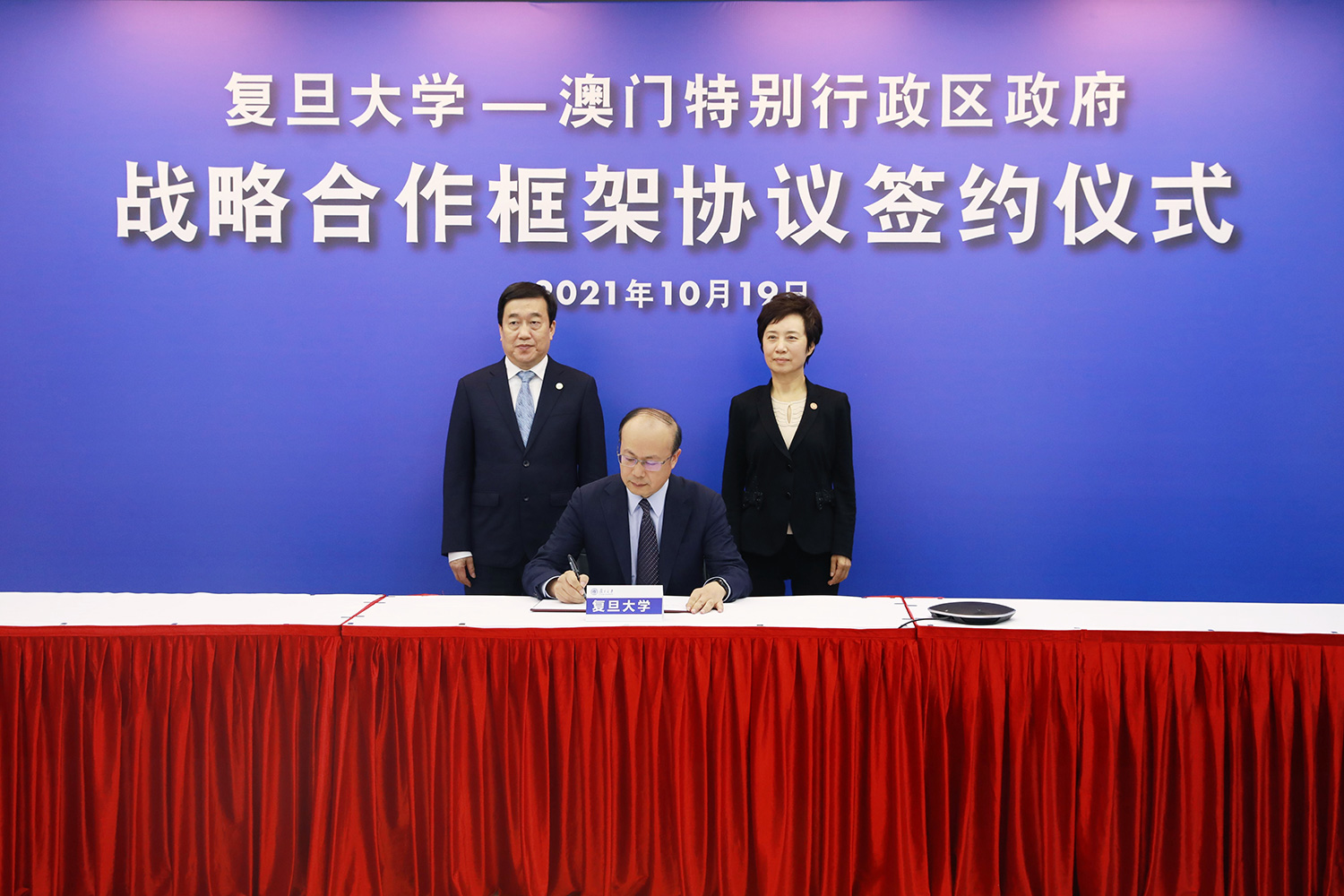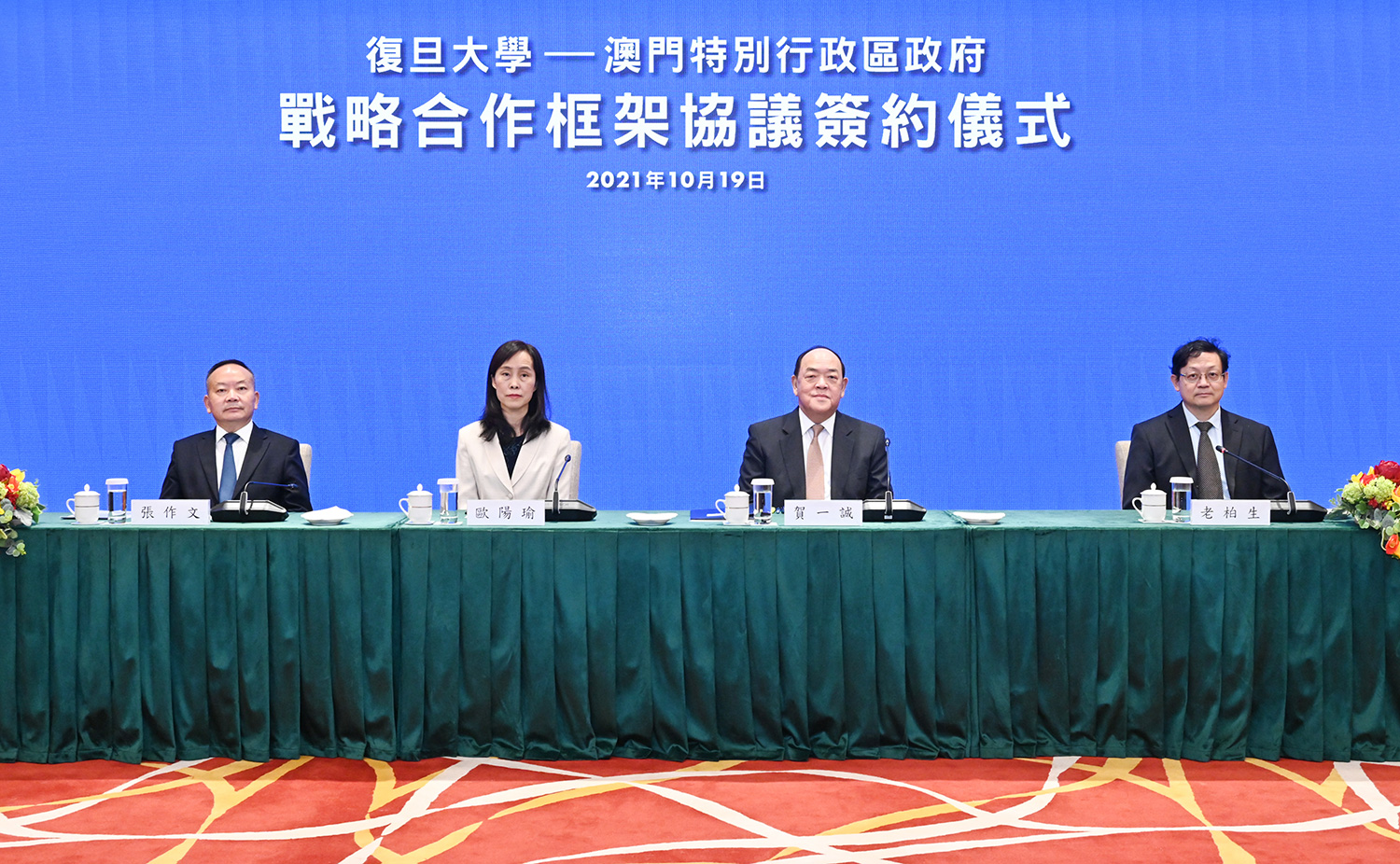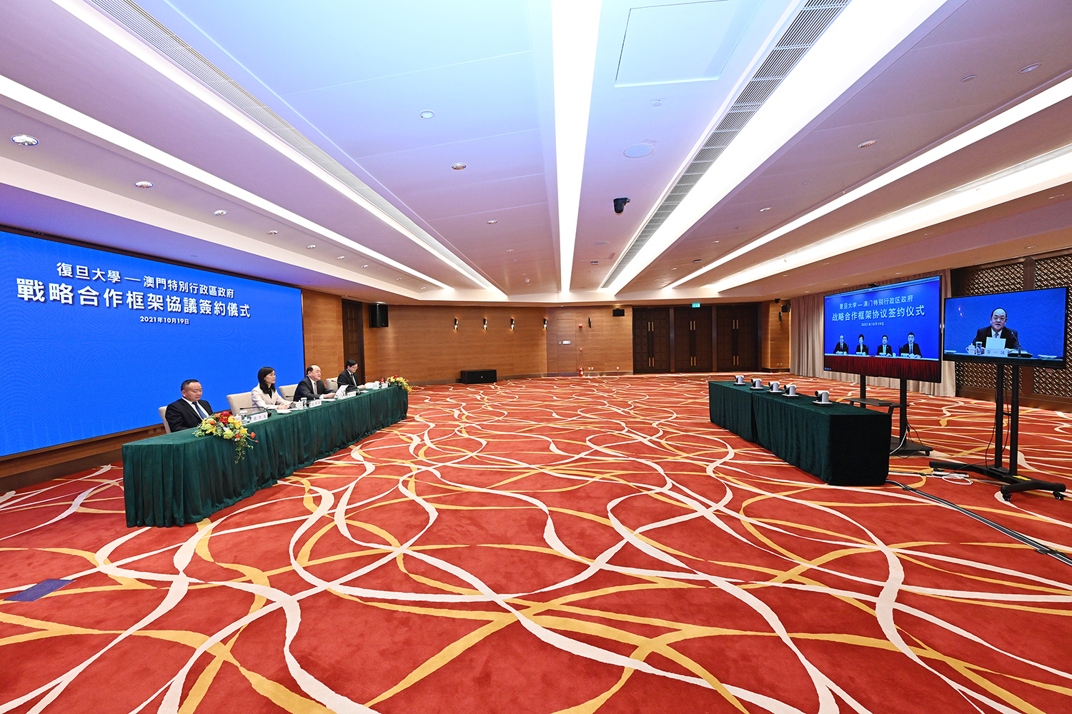 其後,雙方透過視頻連線方式,在行政長官賀一誠、社會文化司司長歐陽瑜;復旦大學由復旦大學黨委書記焦揚、校長許寧生的共同見證下,特區政府教育及青年發展局局長老柏生與復旦大學副校長陳志敏簽署了合作協議。